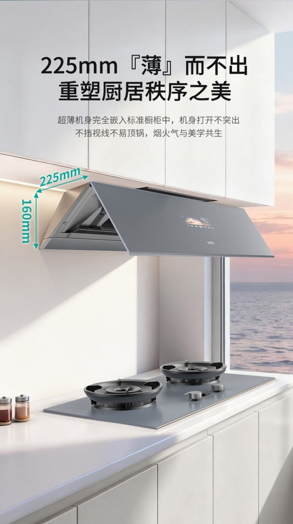 当厨房开始承载这种被反复确认的生活期待,围绕它的产品与空间,也就不再只是功能的叠加,而是体验的重构。比如,在真实的场景中,烟机不再只是承载吸走油烟的任务,而开始承担起维持厨房状态的角色。华帝快拢吸超薄烟机E6095ZS,所提供的,正是让这种“理想厨房”真正落地的关键条件之一。